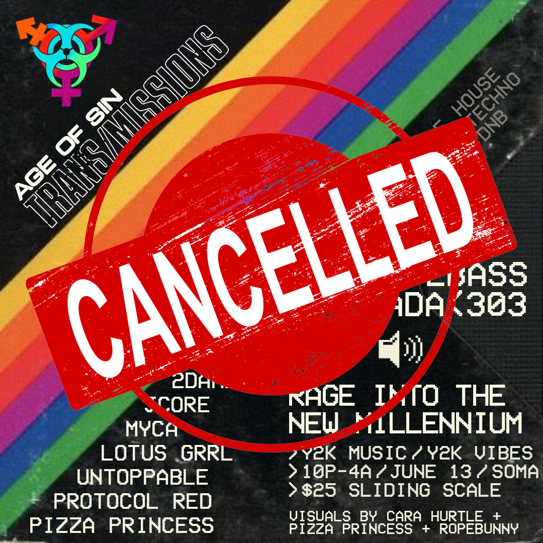 Hey fellow ravers, we’re really sorry to do this, but due to issues beyond our control, we’ve had to postpone the upcoming Age of Sin: TRANS/MISSIONS party on June 13th. We’ve stopped ticket sales, and existing tickets will be refunded via Resident Advisor. We appreciate your dedication and patience as we regroup and we hope you can join us again in the future.